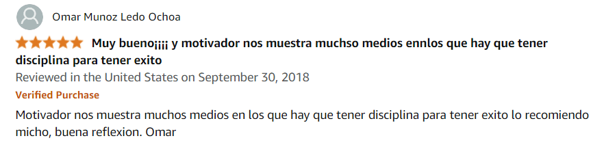 "Muy bueno, y nos muestra muchos medios en los que hay que tener disciplina para tener exito, lo recomiendo mucho!